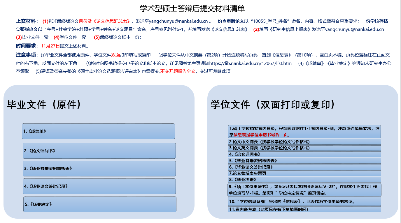 硕士生答辩结束后需要及时准备各种毕业及申请学位的材料,所需材料见附件,学术型硕士生需要提交的材料清单如下: