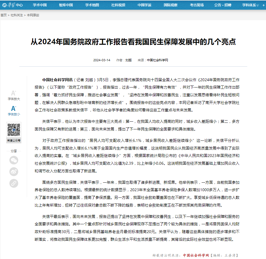 中国社会科学网讯(记者 刘越)3月5日,李强总理代表国务院向十四届全国人大二次会议作《2024年国务院政府工作报告》(以下简称“政府工作报告”),报告指出,过去一年,“民生保障有力有效”,并对下一年的民生保障工作作出部署,强调“着力抓好民生保障,推进社会事业发展”,“坚持在发展中保障和改善民生,注重以发展思维看待补民生短板问题,在解决人民群众急难愁盼中培育新的经济增长点”。围绕报告中的这些亮点内容,本网记者采访了雷竞技RAYBET社会工作与社会政策系教授关信平 ,听他从社会学学者的角度如何看待这些工作重点与未来发展。