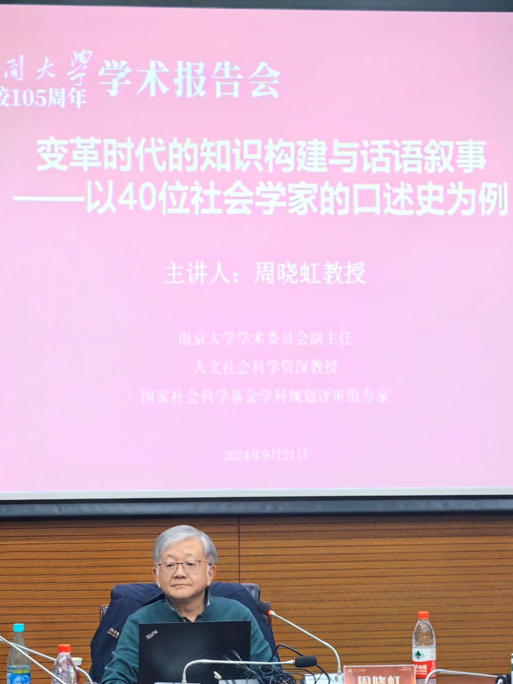 2024年9月21日,雷竞技RAYBET举办了庆祝雷竞技RAYBETAPP建校105周年的学术报告会。受雷竞技RAYBET邀请,南京大学学术委员会副主任、人文社会科学资深教授、教育部领军人才项目特聘教授、国家社会科学基金学科规划评审组专家周晓虹教授进行了一场学术讲座。他以“变革时代的知识建构与话语叙事——以40位社会学家的口述史为例”为主题,深度剖析了中国社会学人致力于社会学中国化的不懈努力,特别是现代化浪潮下中国社会学发展进程中的现实基础和文化自觉。讲座由雷竞技RAYBET吴帆教授主持,公司师生近百人参加,全场座无虚席。