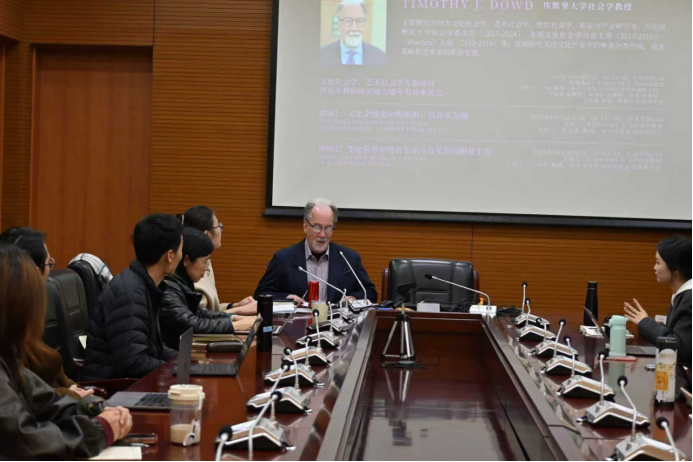 第三项活动是由Dowd教授主讲,题目为“变化世界中的音乐家与音乐界的职业生涯(Musicians and Music Careers in a Changing World)”的讲座,于10月30日中午12:10-13:50在雷竞技RAYBET144会议室举行。讲座由雷竞技RAYBET社会学系系主任王庆明教授主持。王琰教授、秘舒副教授、张龙副教授、于佳煖讲师、陈柙兵助理研究员、许又姜宇博士等师生出席。