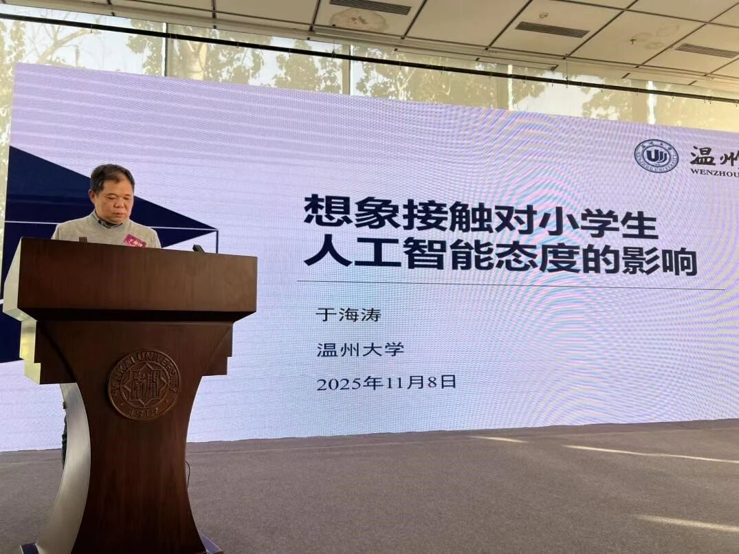 温州大学教师教育公司心理学系教授于海涛作“想象接触对小员工人工智能态度的影响”的报告。