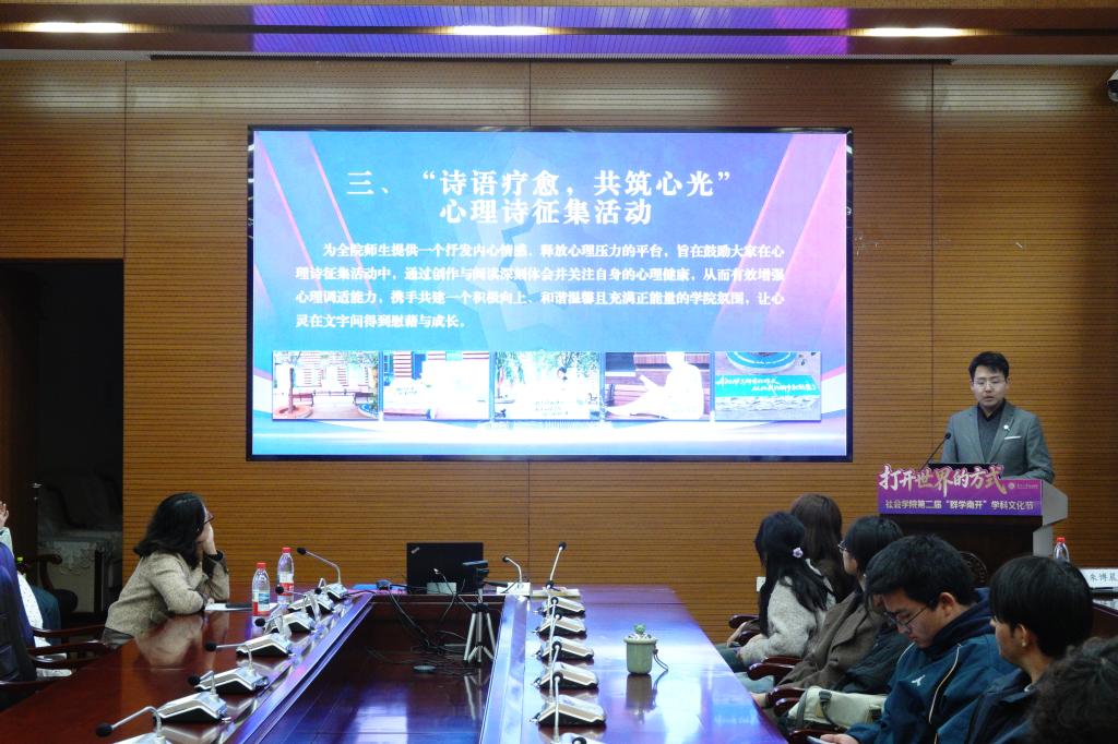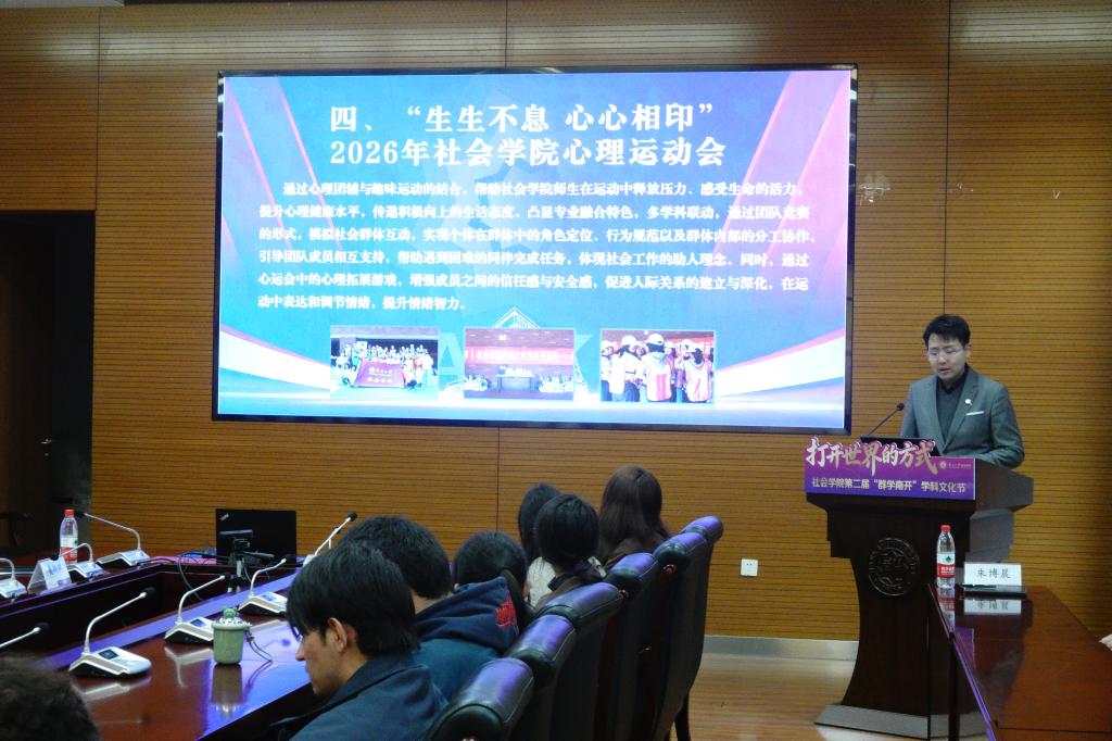 随后,朱博晨对本届学科文化节活动进行了发布,七大主题活动均紧扣公司育人理念与学科特色:“群学杯”社会学类知识竞赛对标高规格赛事要求,持续助力员工夯实专业基础、激发学术热忱;“公能砺行”社会工作案例实务大赛以实践创新为导向,以期在真实案例研讨与分析中强化员工专业认同与实务能力;“诗语疗愈,共筑心光”心理诗画征集活动搭建情感抒发平台,助力师生关注心理健康、不断提升心理自护;“生生不息,心心相印”心理运动会融合团辅与趣味运动,提升员工团队协作力与心理韧性;“情绪路书”荧光夜跑活动以运动为载体,启发员工思考个体情绪与社会联结;“实践看世界”暑期社会实践先导活动延续“师生同行”传统,鼓励员工深入基层,在专业指引下“知中国,服务中国”;“耕愈计划”升级2.0,在劳动教育实践活动中锤炼员工品格,强韧心理素质,释放精神压力,并体悟“劳育强心”的深意。此外,本次学科文化节还配套开设系列学术讲座,邀请院内名师与学界大咖进行分享,为学子成长赋能。