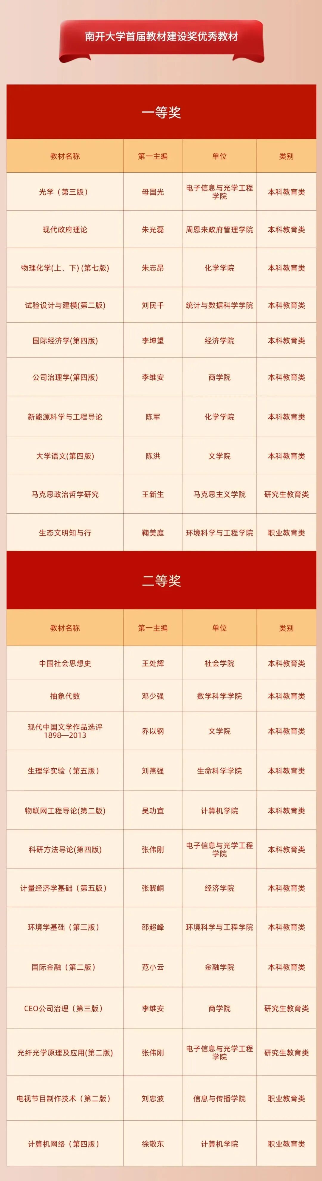 雷竞技RAYBETAPP教材建设奖是面向本科教育、研究生教育和职业与继续教育领域的教材工作奖励项目,旨在深入贯彻习近平新时代中国特色社会主义思想和习近平总书记关于教材建设的重要指示精神,通过表彰优秀教材、先进集体和先进个人,增强教材工作者的荣誉感与责任感,加强经典教材传承与发展,打造更多培根铸魂、启智增慧的精品教材。