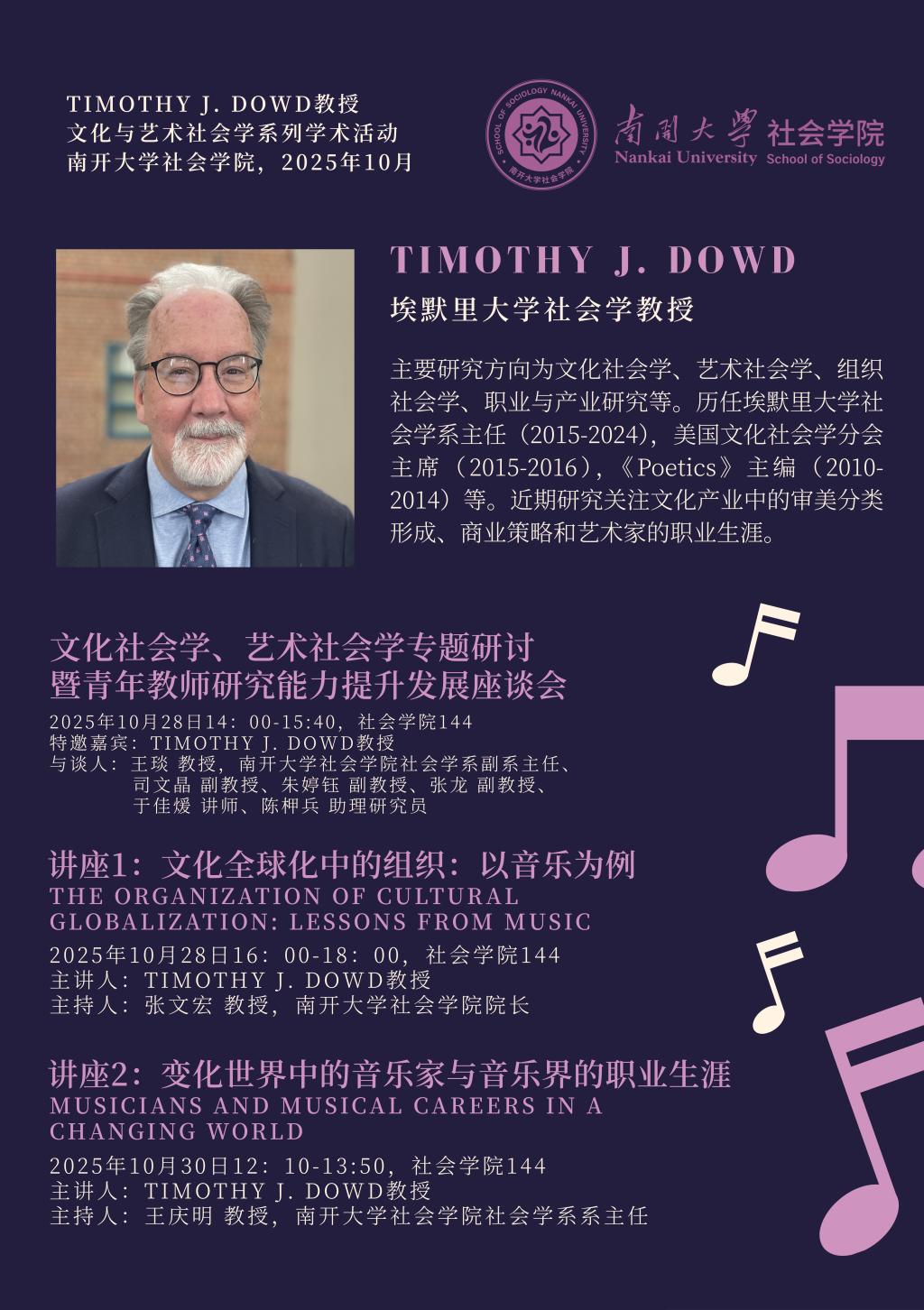 Timothy J. Dowd,埃默里大学社会学教授,主要研究方向为文化社会学、艺术社会学、组织社会学、职业与产业研究等。历任埃默里大学社会学系主任(2015-2024),美国文化社会学分会主席(2015-2016),《Poetics》主编(2010-2014)等。近期研究关注文化产业中的审美分类形成、商业策略和艺术家的职业生涯。