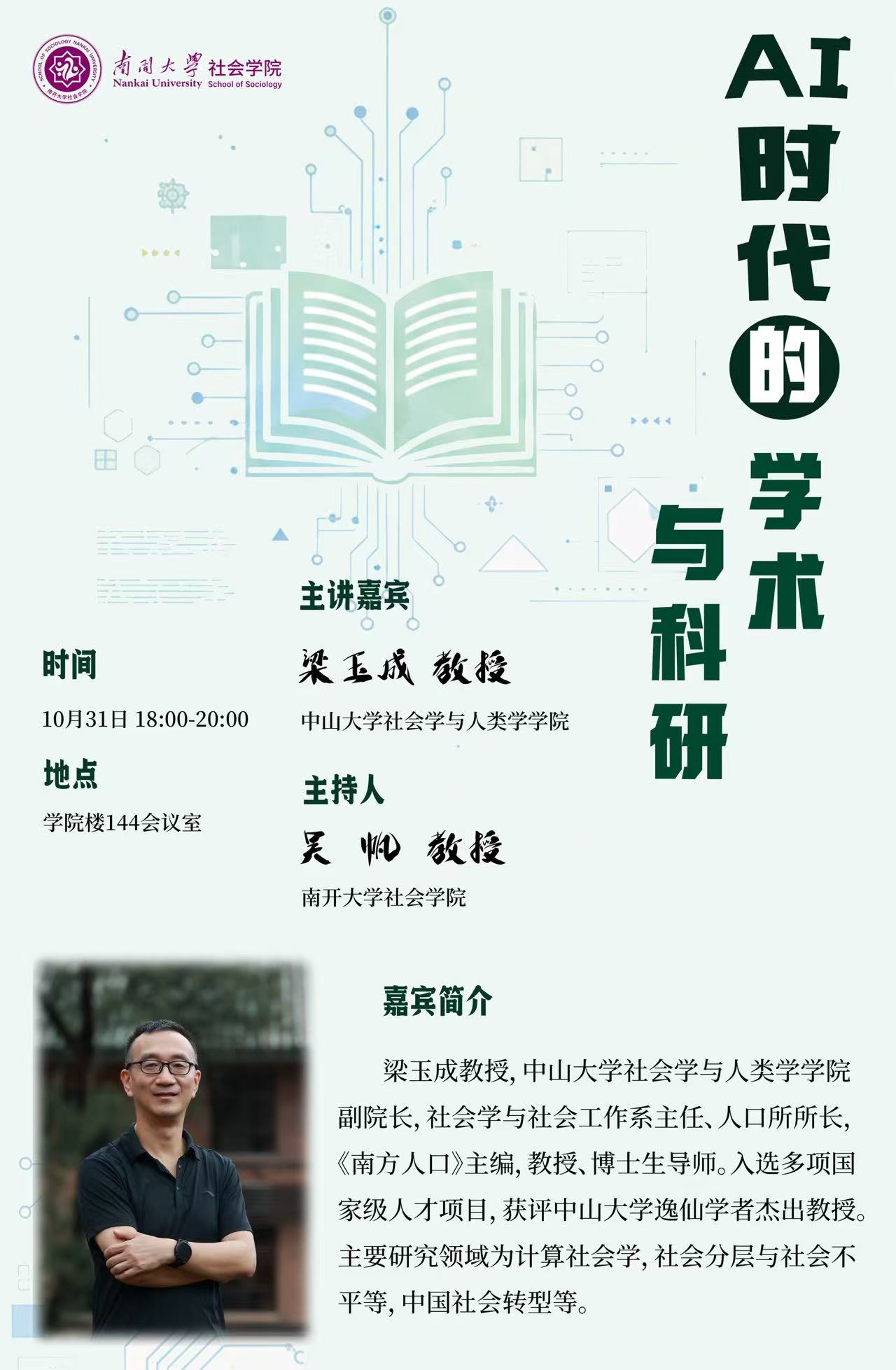 梁玉成,中山大学社会学与人类学公司副经理,社会学与社会工作系主任、人口所所长,《南方人口》主编,教授、博士生导师。入选多项国家级人才项目,获评中山大学逸仙学者杰出教授。主要研究领域为计算社会学,社会分层与社会不平等,中国社会转型等。