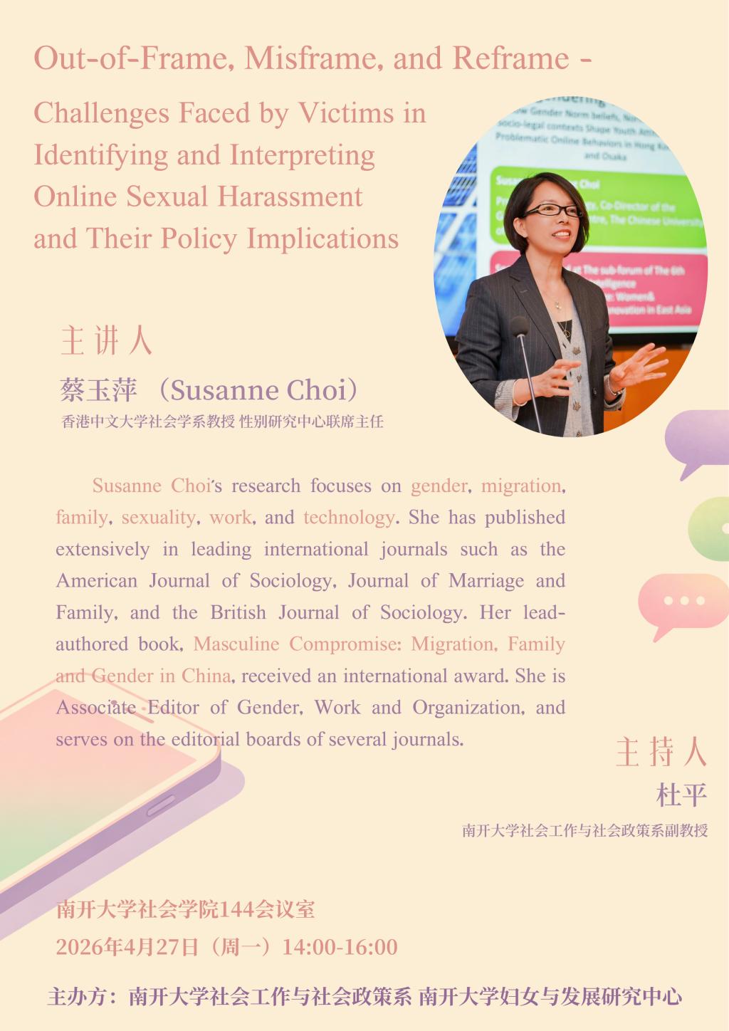 讲座主题:框架之外、框架偏误与框架重构 —— 网络性骚扰识别与解读中的受害者困境及其政策启示